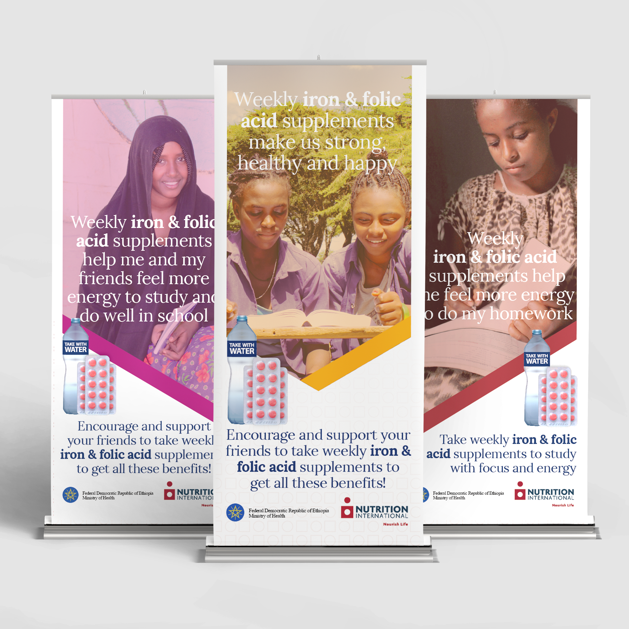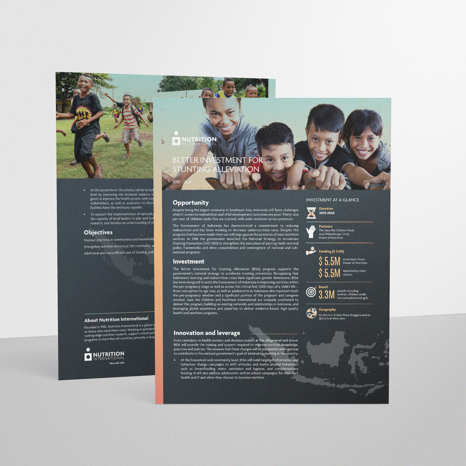 We have been working on various projects during our collaboration with Nutrition International. Starting from postcards up to complex multi-page publications, websites, as well as digital marketing components, such as social network shareables and email newsletter templates.